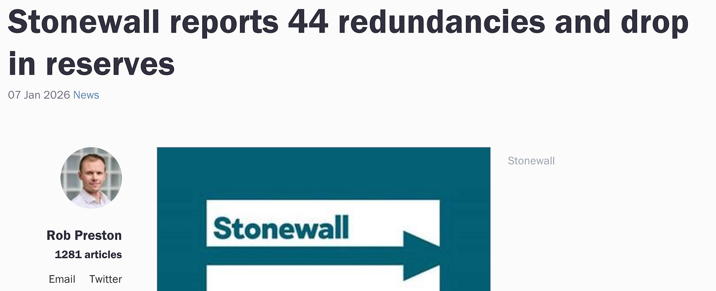 Meanwhile, more bad news for Stonewall, whose reserves, at £100,000, are now lower than those of any of even the smallest charities I currently work with (eg. one with a £200k turnover...) I have a bad feeling here….