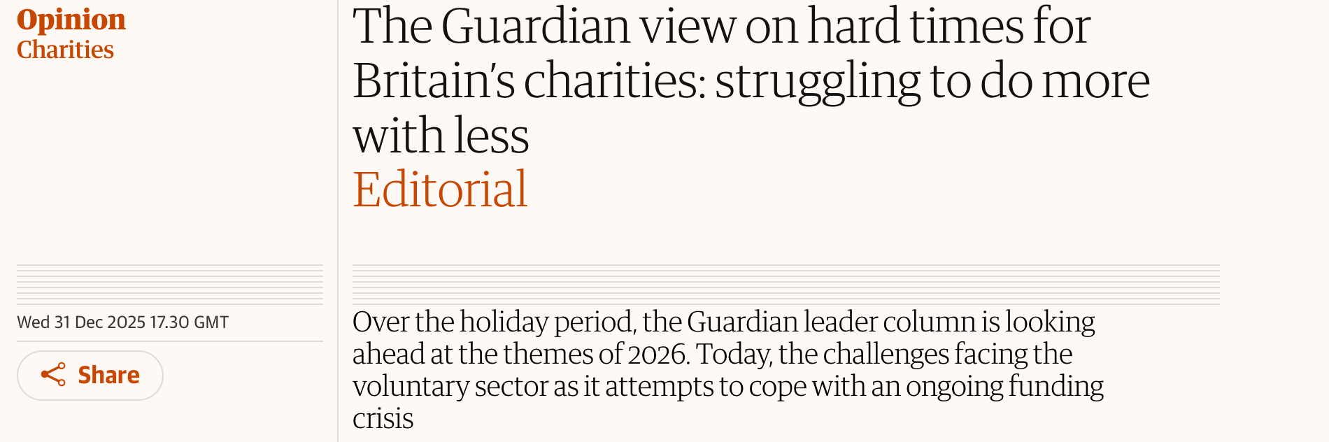 The thing is, we’re in a very difficult place, which even the Guardian has now discovered. What they have noticed is that, positive as the Civil Society Covenant is, what charities really need is, erm, cash.