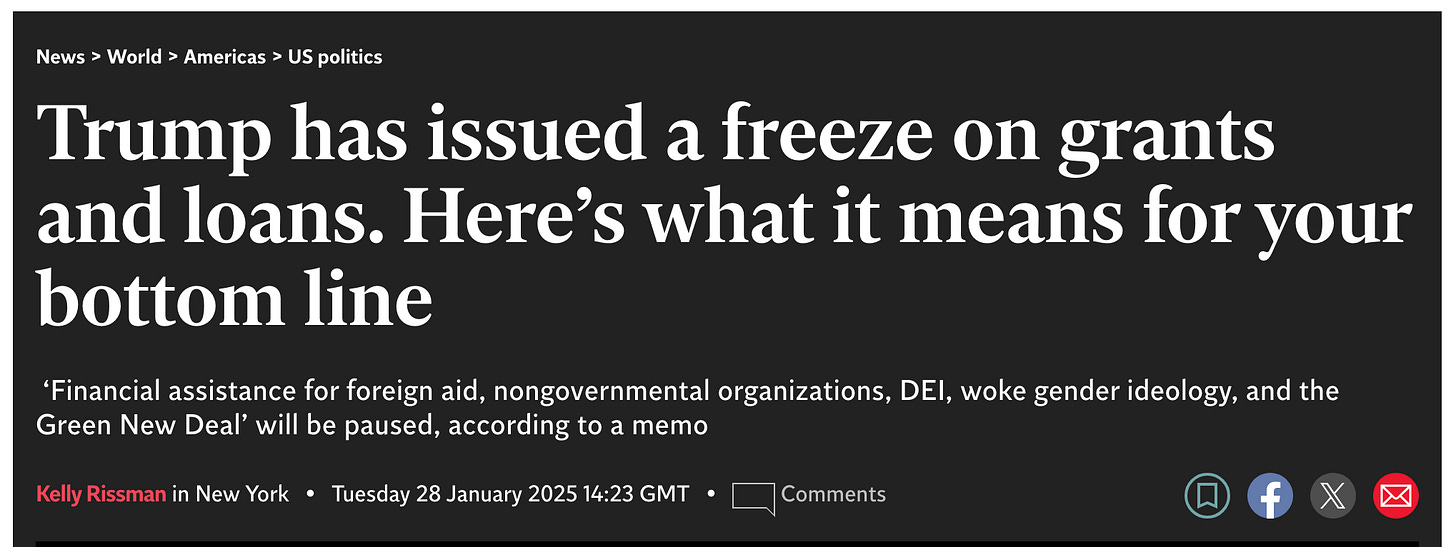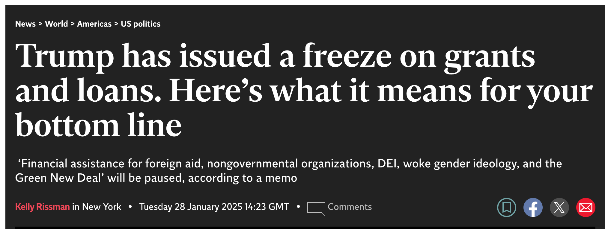 And so it begins for our nonprofit compatriots abroad: Trump has suspended grants for nonprofits to check whether they support woke ideology, DEI or green new deal approaches, among others. I was talking to a new colleague in the US nonprofit sector today who focuses on green issues and carbon. Getting support in the US was already tough. Now what?