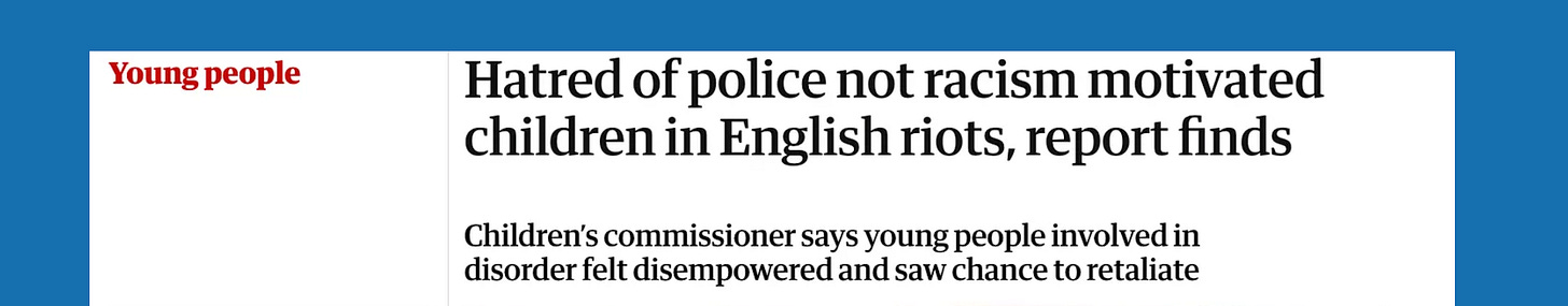 Meanwhile, the second youth riots (2024, not 2011) have been subject to an inquiry by the Children’s Commissioner. This has not revealed what people thought it would.
