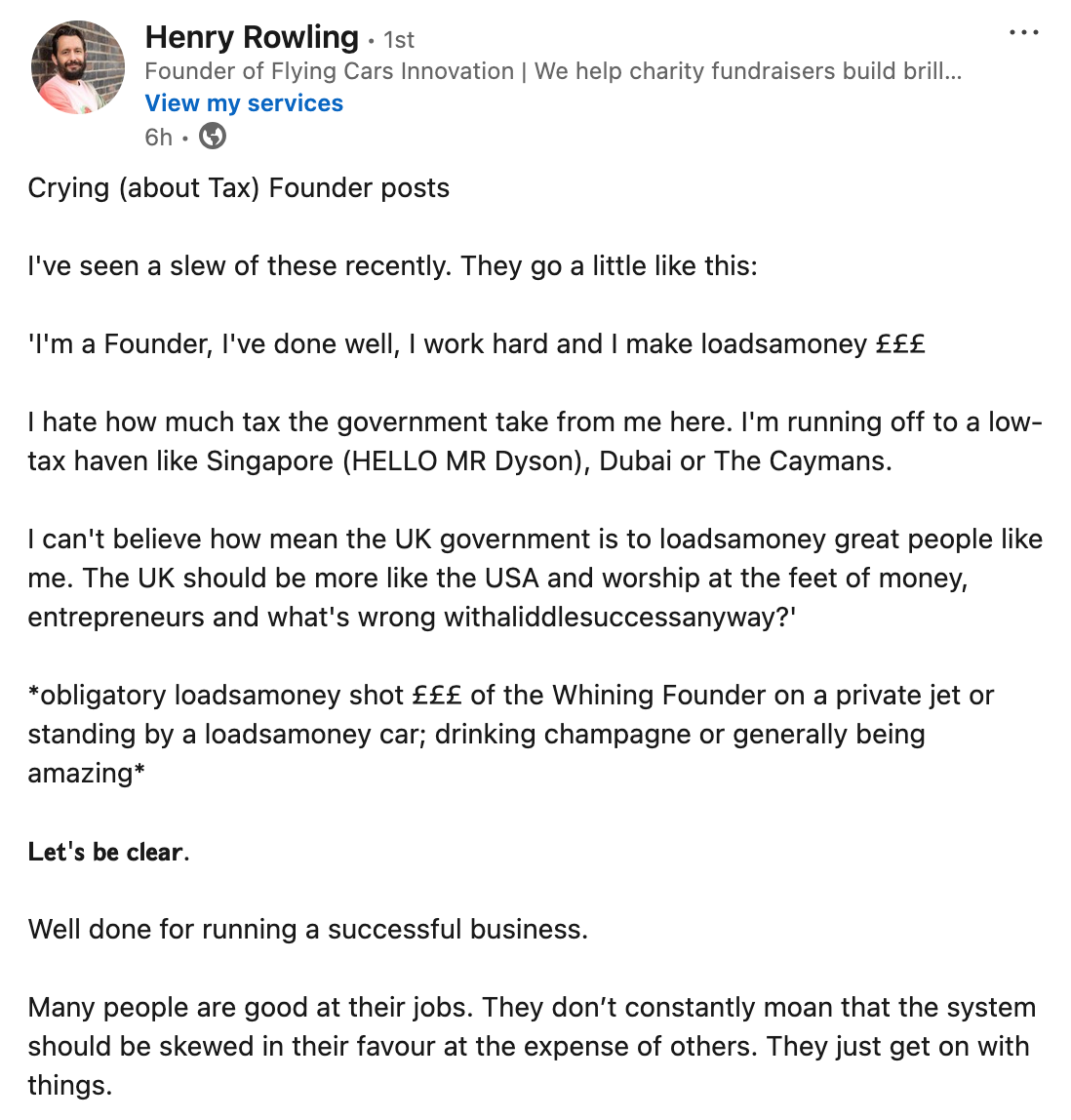 I like very much what Henry Rowling (who I always confuse for Henry Rollins) said about tax and moaning CEOs.