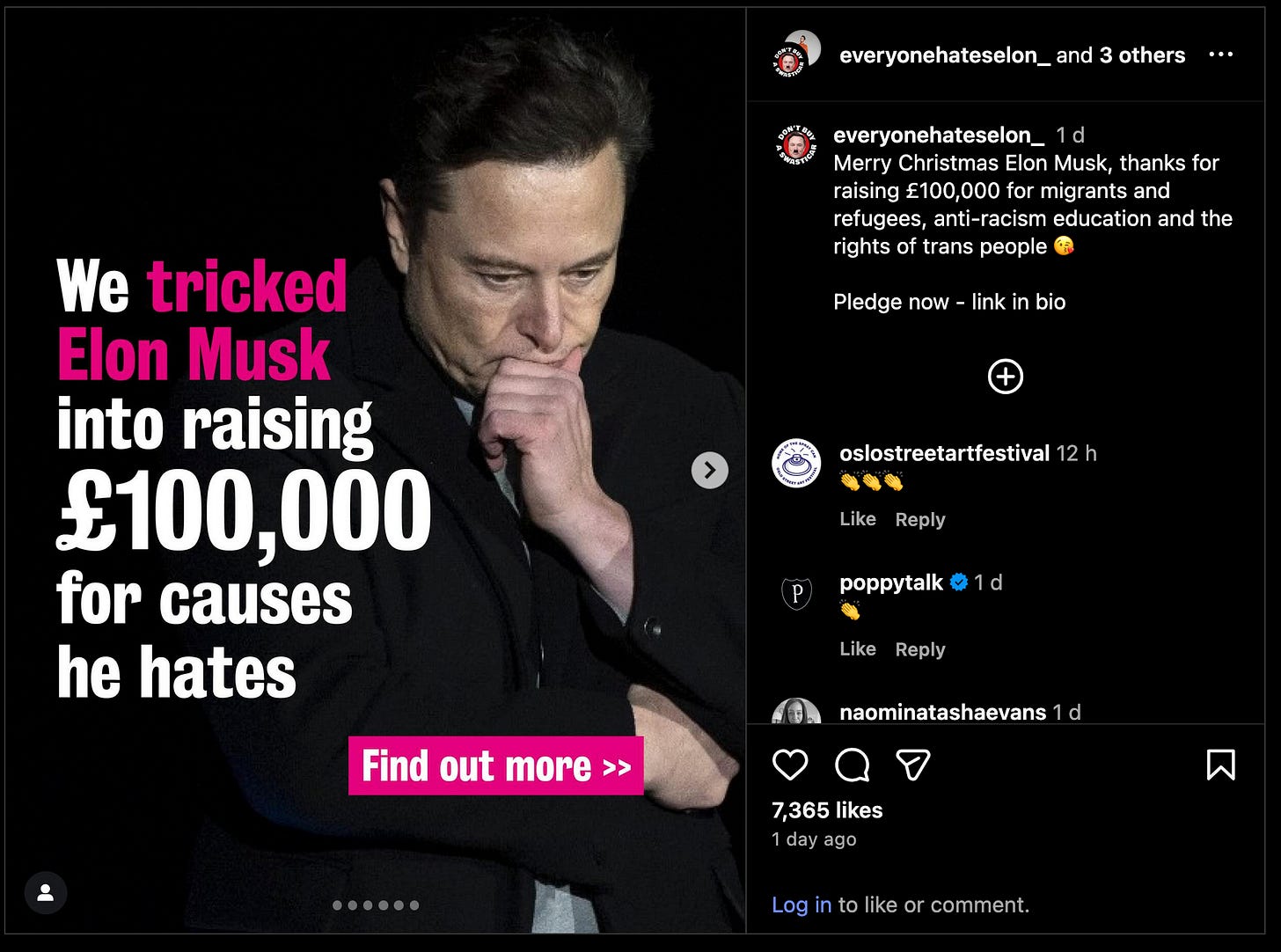 We need to end on a high. Well, a high based from the viewpoint of a mouse’s nethers. I’ve been enjoying seeing small acts of resistance in civil society. So for me, perhaps the most uplifting story of the year is the success of the Everyone Hates Elon campaign, which raised £100,000 for causes hated by Elon Musk: asylum and migrants, anti-racism, trans people and so on. They did this by getting people to pledge money every time Musk wrote a hateful tweet. A roaring success of course….