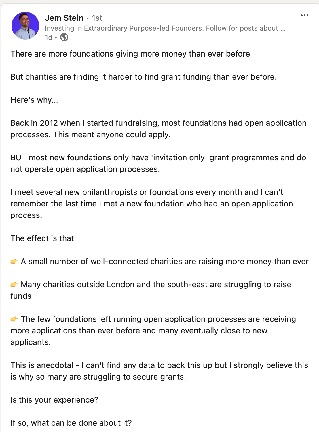Second, Jem Stein, one of the more interesting Linkedin people, had this to say about changes in trusts and foundations. I’m really interested to see if this is the case. 2